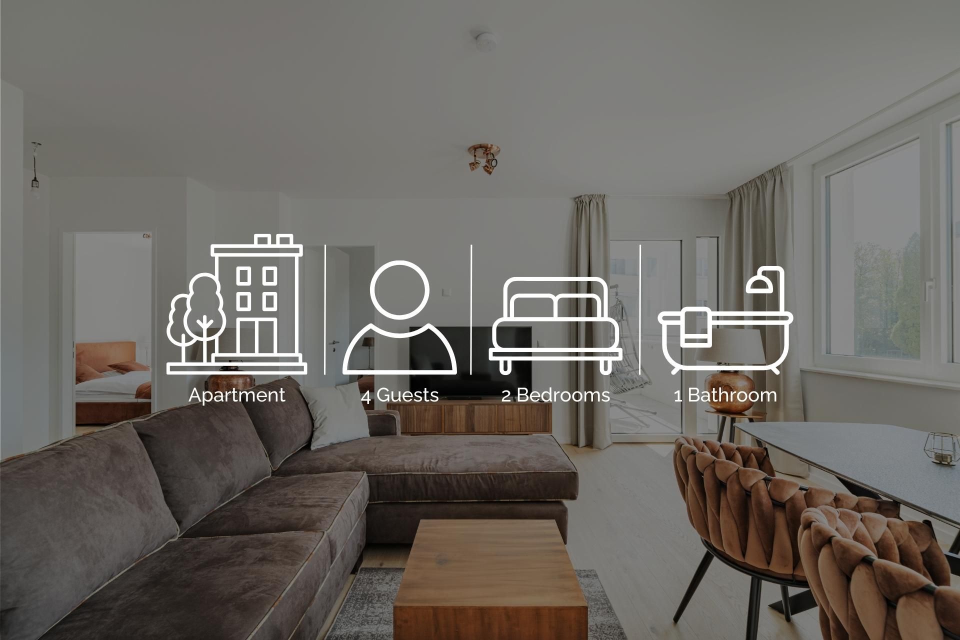 Das Schlafzimmer ist großzügig geschnitten und stilvoll eingerichtet, um Ihnen einen erholsamen Schlaf zu garantieren. Für zusätzliche Gäste steht eine Couch zur Verfügung, die Platz für eine weitere Person bietet.